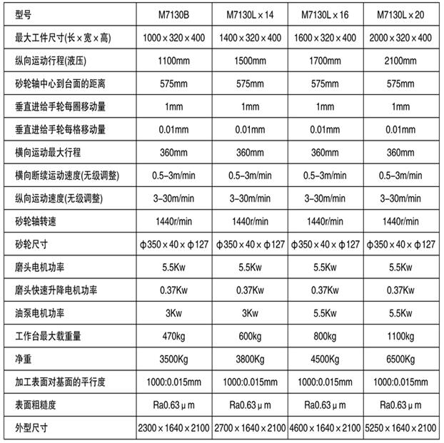 性能及工作特點: 此平面磨床以砂輪周邊或側(cè)面磨削工件的平面,工件可以固定在工作臺上,或吸牢在電磁吸盤上,其材質(zhì)可以是鋼、鑄鐵、石墨、或有色金屬。機(jī)床工作臺的左右和磨頭的前后運(yùn)動都是用液壓驅(qū)動,無極調(diào)速。磨頭的前后運(yùn)動也可手動操作。磨頭的垂直方向除手動進(jìn)刀外還配有快速升降機(jī)構(gòu),減輕勞動強(qiáng)度提高效率。主要規(guī)格技術(shù)參數(shù)